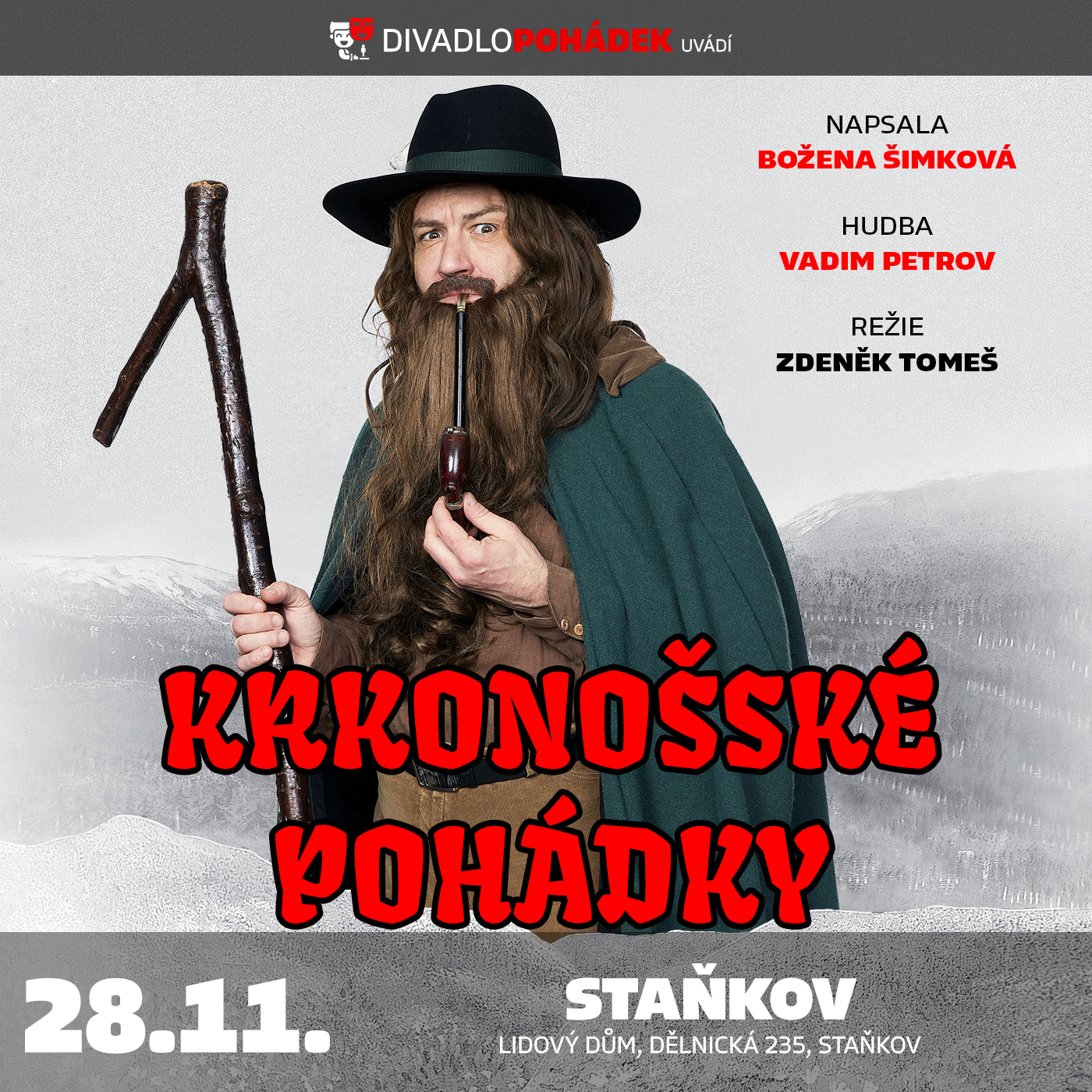 Další reprízu divadelního zpracování známého večerníčku Krkonošské pohádky uvedeme ve čtvrtek 28. listopadu 2024 od 17.30 hod. v Lidovém domě Staňkov.